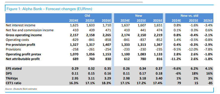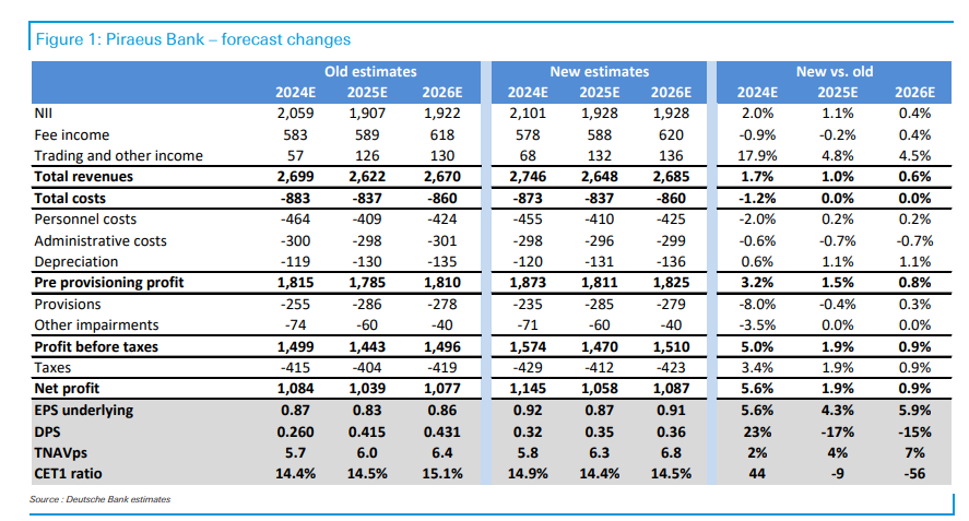 Εν συνόλω, αυτό οδηγεί σε αναθεώρηση των εκτιμήσεων για τα κέρδη. Για το 2024, οι εκτιμήσεις της Deutsche Bank μειώνονται κατά 11% λόγω της δραστηριότητας εκκαθάρισης μη εξυπηρετούμενων ανοιγμάτων (NPA) και των προβλέψεων για το πρόγραμμα εθελουσίας εξόδου, ενώ οι εκτιμήσεις για το 2025 είναι ελαφρώς υψηλότερες και για το 2026 ελαφρώς χαμηλότερες, επηρεασμένες από χαμηλότερα από τα αναμενόμενα επιτόκια. Σε γενικές γραμμές, όμως, προβλέπεται σημαντική βελτίωση καθαρών κερδών και στις δύο χρονιές, αντανακλώντας θετικές τάσεις.