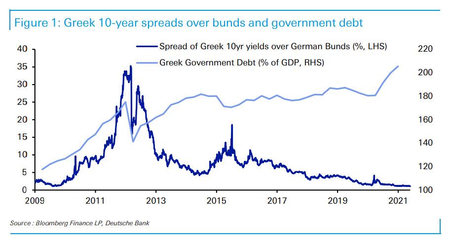Σύμφωνα δε με την Deutsche Bank, πιο εντυπωσιακό είναι ακόμη το γεγονός πως η πτώση του spread συμβαίνει ενώ το χρέος της Ελλάδας έχει εκτοξευθεί πάνω από τα επίπεδα του 200% επί του ΑΕΠ, λόγω της πανδημίας.