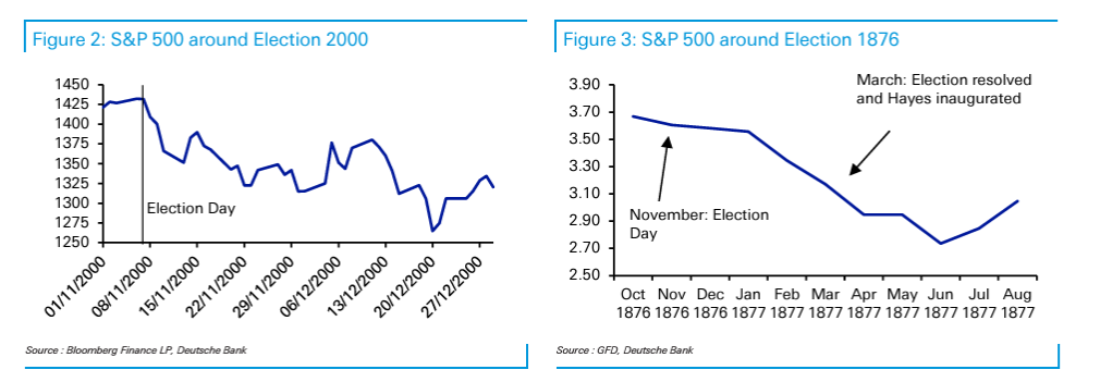 2 Ιστορικά, όταν τα εκλογικά αποτελέσματα επεκτείνουν την αβεβαιότητα, αποτελούν δύσκολο σκηνικό για τις αμερικανικές μετοχές. Το 2000 και το 1876, το αποτέλεσμα μετά την ημέρα των εκλογών ήταν αμφίβολο. Για περισσότερο από έναν μήνα και στις δύο περιπτώσεις δεν υπήρχε νικητής, λέει η Deutsche Bank. Ειδικότερα, το 2000, ο Τζορτζ Μπους κέρδισε με μικρή διαφορά 0,009% χάρη στη Φλόριντα. Εν μέσω της αβεβαιότητας, ο S&P 500 υποχώρησε 1,6% την επόμενη μέρα (8 Νοεμβρίου) πριν δει περαιτέρω πτώση 0,7% και 2,4% την Πέμπτη και την Παρασκευή, αντίστοιχα. Στην πραγματικότητα, ο Νοέμβριος του 2000 ήταν ο χειρότερος για τον S&P 500 εκείνη τη χρονιά, με πτώση 8% από την αρχή μέχρι το τέλος.