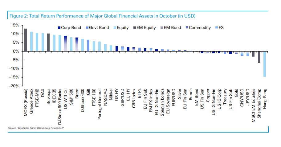 Κατά τ’ άλλα, όπως αναφέρει η γερμανική τράπεζα, μετά από ένα καταστροφικό σε απόδοση το τρίτο τρίμηνο, ο Οκτώβριος αποδείχθηκε πολύ ισχυρότερος μήνας για τα χρηματοοικονομικά περιουσιακά στοιχεία.