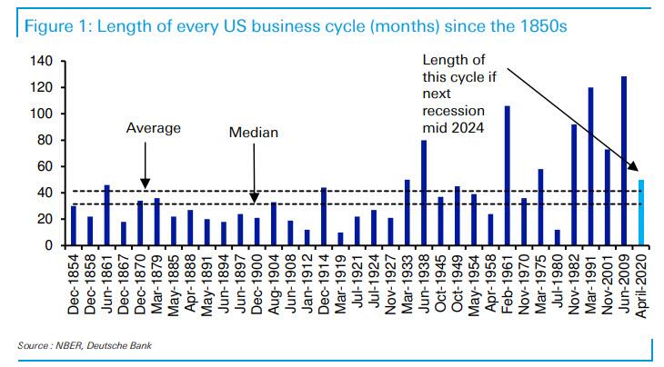 Πάντως, αν όσα γράφει αντιστοιχούν στην πραγματικότητα, η φάση επέκτασης του τρέχοντος οικονομικού κύκλου δεν πρόκειται να εξαντλήσει την τετραετία (κάτι σαν τις κυβερνήσεις εδώ στην Ελλάδα). Βέβαια, αν και αυτό το χρονικό διάστημα φαίνεται μικρό, δεν είναι – πρόκειται για τον 8ο μεγαλύτερο κύκλο των ΗΠΑ από τους συνολικά 35 τα τελευταία 170 χρόνια.