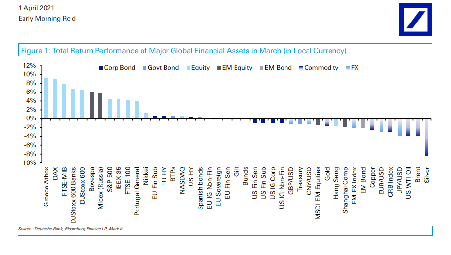 Με κέρδη της τάξης του 9,2% τον Μάρτιο του 2021 και 6,9% από τις αρχές της χρονιάς, το Ελληνικό Χρηματιστήριο ξεχωρίζει με τις επιδόσεις του, έπειτα από την εντυπωσιακή ανάκαμψη που ακολούθησε το μεγάλο sell-off του Ιανουαρίου του 2021 (-7,4%), σύμφωνα με όσα αναφέρει η Deutsche Bank.