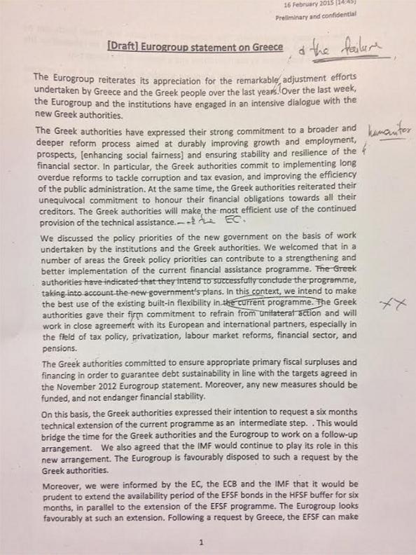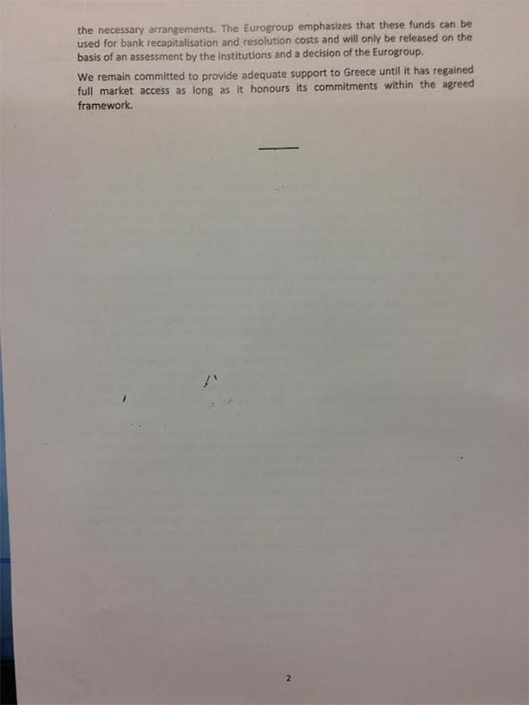 Σύμφωνα με το κείμενο το οποίο δόθηκε στον υπουργό Οικονομικών, Γιάννη Βαρουφάκη, το Eurogroup καλούσε την Ελλάδα «να μην προβεί σε μονομερείς ενέργειες».