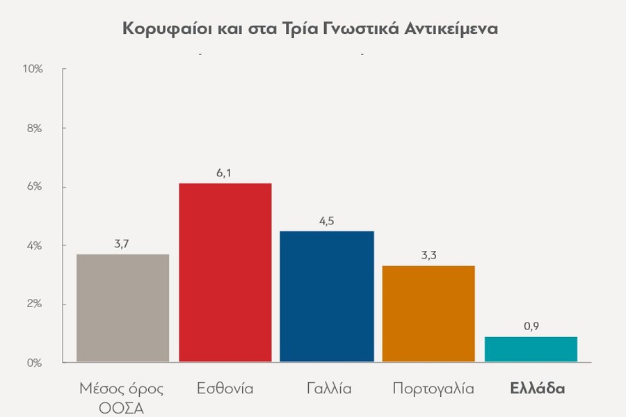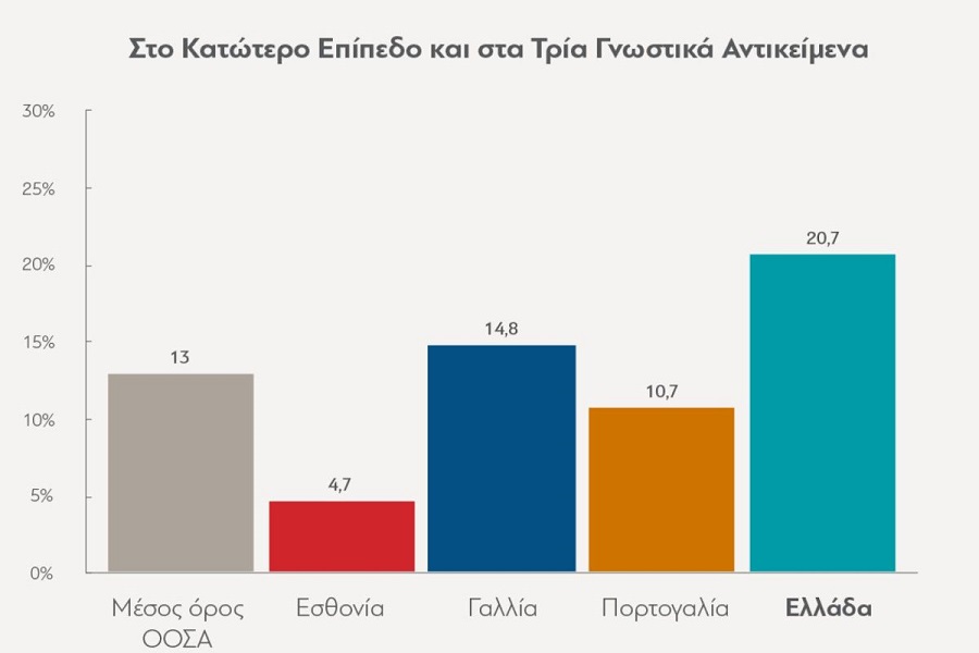 Λιγότερο από 1% των Ελλήνων μαθητών είναι στην ανώτερη κατηγορία και στα τρία γνωστικά αντικείμενα. Ένας στους πέντε Έλληνες μαθητές είναι στην κατώτατη κατηγορία και στα τρία γνωστικά αντικείμενα.