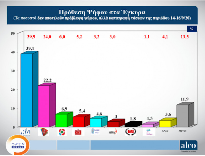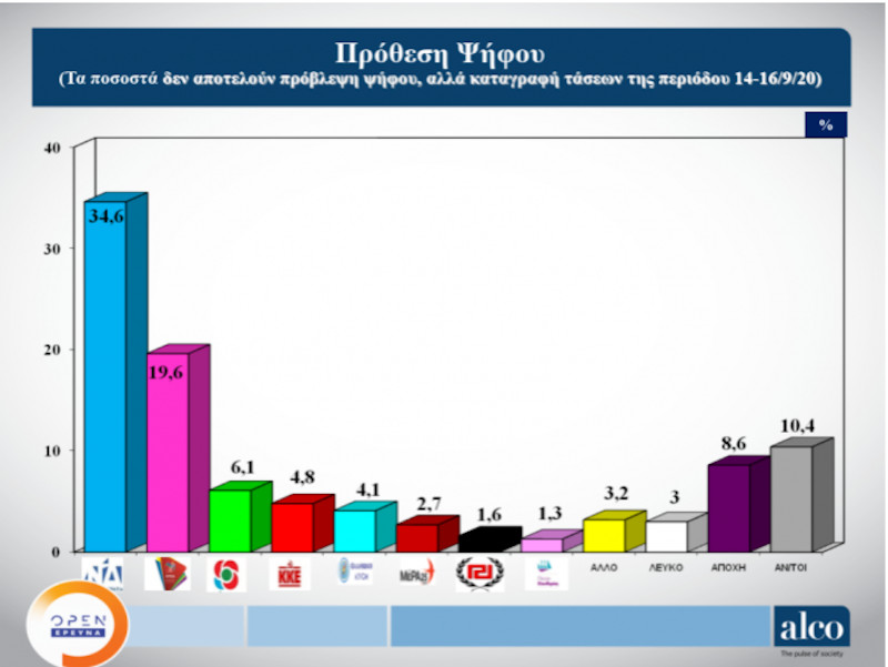 Με 16,9 μονάδες προηγείται η ΝΔ του ΣΥΡΙΖΑ, σύμφωνα με νέα δημοσκόπηση της ALCΟ για το OPEN.