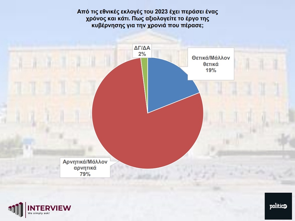 Η κυβέρνηση δεν φαίνεται να κερδίζει την εμπιστοσύνη των πολιτών, καθώς το 79% των ερωτηθέντων αξιολογεί αρνητικά το έργο της, ενώ μόλις το 19% εκφράζεται θετικά. Η ευρεία δυσαρέσκεια αυτή αντικατοπτρίζεται και στην απήχηση των πολιτικών αρχηγών. Ειδικότερα, ο Κυριάκος Μητσοτάκης διατηρεί την πρώτη θέση στη δημοφιλία με 29,8% θετικές γνώμες, ωστόσο το 68,3% των πολιτών τον αξιολογεί αρνητικά.