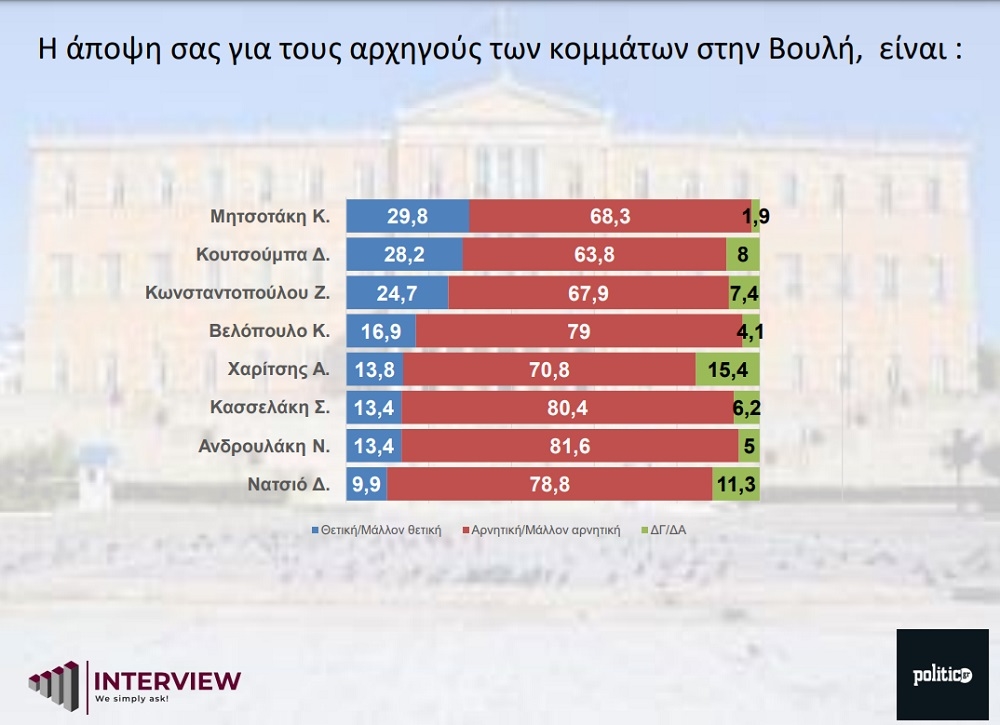 Ο Δημήτρης Κουτσούμπας και η Ζωή Κωνσταντοπούλου ακολουθούν με 28,2% και 24,7% θετικές γνώμες αντίστοιχα, αν και οι δύο έχουν επίσης υψηλά ποσοστά αρνητικών γνωμών (63,8% και 67,9%). Τα υψηλότερα ποσοστά δυσαρέσκειας συγκεντρώνουν ο Νίκος Ανδρουλάκης (81,6%), ο Στέφανος Κασσελάκης (81,6%), ο Κυριάκος Βελόπουλος (79%) και ο Δημήτρης Νατσιός (78,8%).