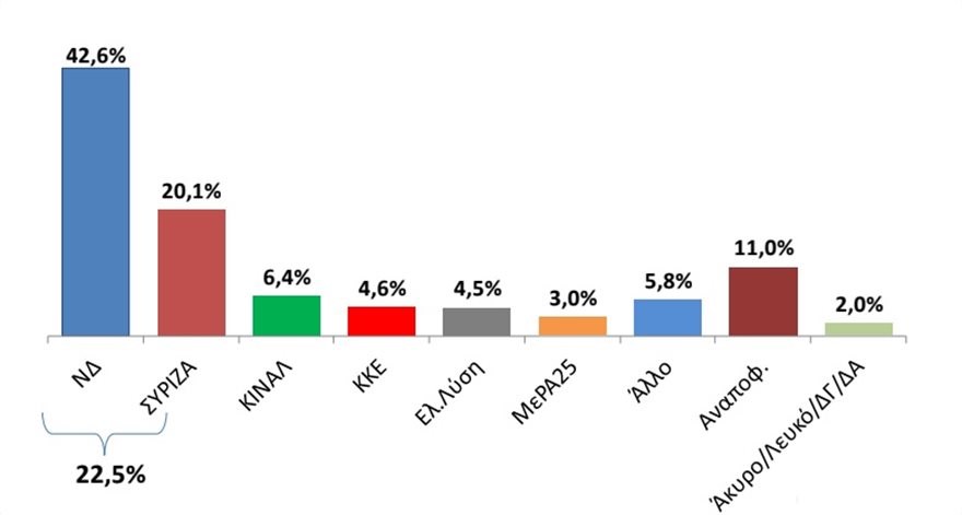 Στην πρόθεση ψήφου, η ΝΔ προηγείται με ποσοστό 42,6% έναντι του ΣΥΡΙΖΑ που συγκεντρώνει 20,1%. Ακολουθούν το ΚΙΝΑΛ με 6,4%, το ΚΚΕ με 4,6%, η Ελληνική Λύση με 4,5% και το ΜέΡΑ25 με 3%.