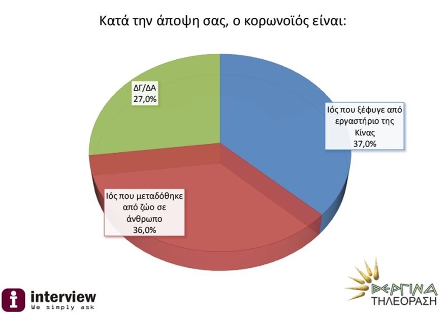 Στη δημοσιότητα έρχεται μία ακόμη δημοσκόπηση, εν μέσω της πανδημίας του κορωνοϊού. Στην πανελλαδική έρευνα που διενήργησε η INTERVIEW για λογαριασμό της ΒΕΡΓΙΝΑ ΤΗΛΕΟΡΑΣΗΣ, οι πολίτες απαντούν σε ερωτήματα σχετικά με την κυβέρνηση, αξιολογούν τους υπουργούς, ενώ εκφράζουν την άποψή τους και για την προέλευση του κορονοϊού.