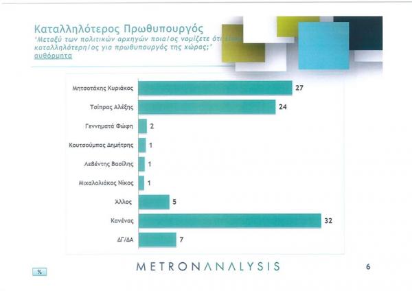 Καταλληλότερος πρωθυπουργός αναδεικνύεται ο Κυριάκος Μητσοτάκης με 27% έναντι 24% του Αλέξη Τσίπρα.