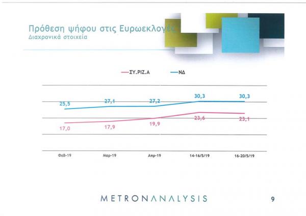 Προβάδισμα 7,2% για τη ΝΔ έναντι του ΣΥΡΙΖΑ καταγράφει η δημοσκόπηση της Metron Analysis που παρουσιάστηκε σήμερα.