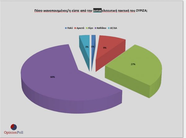 Το 18% δηλώνει οτι αν είχαμε Κυβέρνηση ΣΥΡΙΖΑ θα πήγαιναν καλύτερα τα πράγματα για την χώρα, με το 76% να έχει αντίθετη άποψη. Την άποψη αυτή υιοθετεί το 2.6% της Ν.Δ, το 53.2% του ΣΥΡΙΖΑ με το 39.3% να έχει αντίθετη άποψη, το 11% του ΚΙΝΑΛ, ΤΟ 9.5% του Κ.Κ.Ε, το 6.9% της ΕΛΛΗΝΙΚΗΣ ΛΥΣΗΣ και το 30.8% του ΜΕΡΑ 25. Η ικανοποίηση από την αντιπολιτευτική πολιτική του ΣΥΡΙΖΑ βρίσκεται στο 10% μειούμενη από το 13% στο οποίο βρισκόταν τον Οκτώβριο και τον Νοέμβριο. Είναι χαρακτηριστικό, ότι μόλις το 26.6% των ψηφοφόρων του ΣΥΡΙΖΑ δηλώνουν ικανοποιημένοι , με το 71.3% να παίρνουν αντίθετη θέση. Στην Ν.Δ ικανοποιημένο δηλώνει το 4.2% και στο ΚΙΝΑΛ το 1.6%.