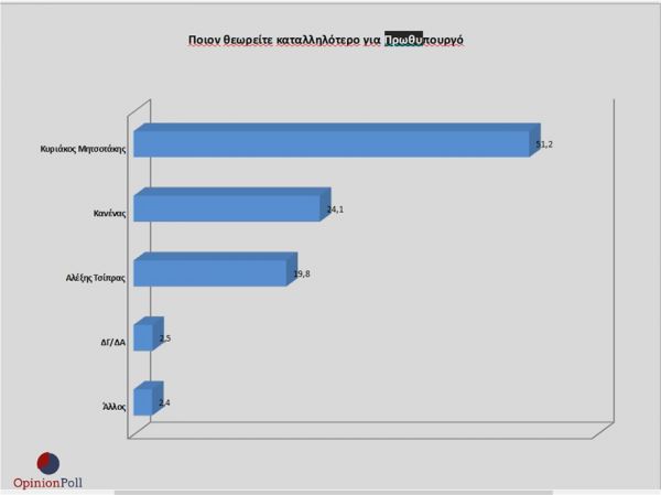 Ως αποτέλεσμα όλων αυτό είναι φυσιολογικό να θεωρείται καταλληλότερος για Πρωθυπουργός από το 51.2%, έναντι 24.1% του ΚΑΝΕΝΑ και 19.8% του Αλέξη Τσίπρα. Τον Κ. Μητσοτάκη επιλέγει το 90.4% της Ν.Δ, το 16.5% του ΣΥΡΙΖΑ, το 68.8% του ΚΙΝΑΛ, το 23.8% του Κ.Κ.Ε , το 50% της ΕΛΛΗΝΙΚΗΣ ΛΥΣΗΣ και το 14.8% του ΜΕΡΑ 25. Ο Α. Τσίπρας προηγείται στην επιλογή στον ΣΥΡΙΖΑ με 54.8% και στο ΜΕΡΑ 25 με 29.6%.