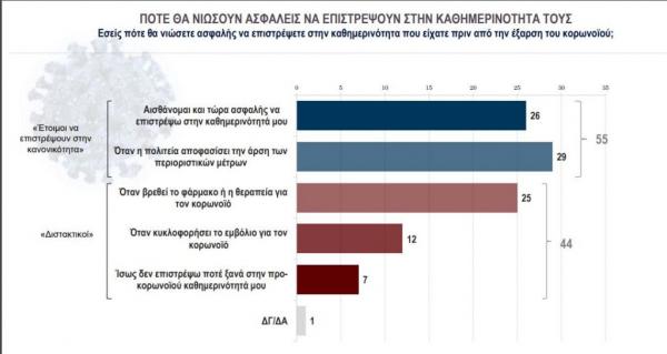 Γενικότερα, το 55% των Ελλήνων εμφανίζονται «έτοιμοι» να επιστρέψουν στην καθημερινότητά τους: από αυτούς οι μισοί (26%) αισθάνονται ήδη ασφαλείς να επιστρέψουν κανονικά στη ζωή τους ενώ οι άλλοι μισοί (29%) περιμένουν το σήμα της πολιτείας. Οι πιο «διστακτικοί» καταγράφονται στο 44%, με το 25% να δηλώνει ότι θα νιώσει ασφάλεια όταν βρεθεί το φάρμακο ή η θεραπεία, το 12% όταν βρεθεί το εμβόλιο, ενώ, τέλος, ένα 7% δηλώνει πως ίσως δεν επιστρέψει ποτέ ξανά στην προ-κορωνοϊού καθημερινότητά του.