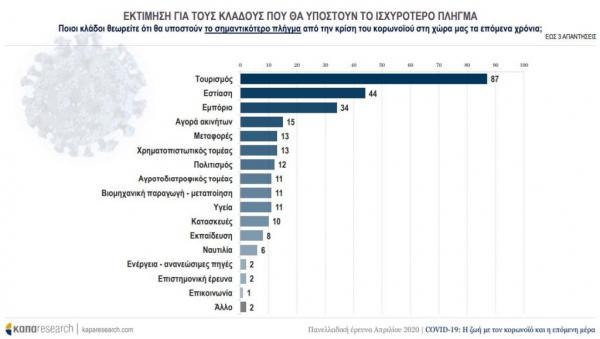 Ο τουρισμός, είναι για τους Έλληνες ταυτόχρονα και ο μεγάλος ασθενής του 2020 αλλά και η βασική ελπίδα για ανάκαμψη: 87% θεωρούν ότι ο τουριστικός κλάδος θα υποστεί τις βαρύτερες συνέπειες από την κρίση [με την εστίαση (44%) και το εμπόριο (34%) να ακολουθούν] αλλά, αναγνωρίζοντας τις περιορισμένες επιλογές της ελληνικής αγοράς, ο τουρισμός, κατά το 63%, αποτελεί, επίσης, τον σημαντικότερο πυλώνα για την ανάκαμψη της οικονομίας. Σε κάθε περίπτωση, η φετινή τουριστική σεζόν θεωρείται χαμένη από το 58% αφού, ούτως ή άλλως, για το 54% η έλευση τουριστών από το εξωτερικό το καλοκαίρι πρέπει να αποτραπεί για υγειονομικούς λόγους, έστω και με τον κίνδυνο να βαθύνει η ύφεση στη χώρα.