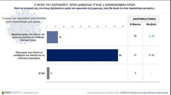 Με τα περισσότερα νοικοκυριά να βιώνουν άμεσα τις οικονομικές της συνέπειες, η πανδημία, από κρίση δημόσιας υγείας που πλήττει την υγεία των πολιτών και το Εθνικό Σύστημα Υγείας, εξελίσσεται σταδιακά σε κρίση οικονομική που πλήττει τα εισοδήματα των πολιτών και τις ελληνικές επιχειρήσεις- η μεταβολή υπέρ της δεύτερης άποψης καταγράφεται στις 43 ποσοστιαίες μονάδες από την προηγούμενη μέτρηση της Κάπα Research, τον Μάρτιο.