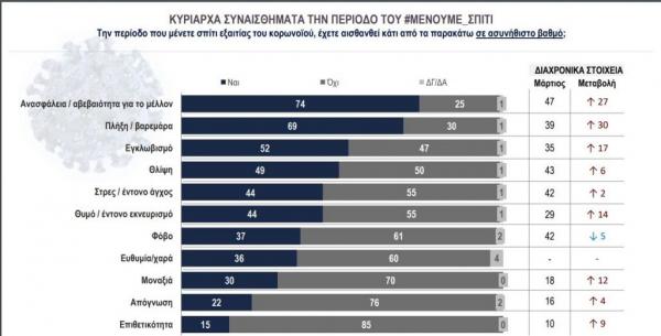 74% δηλώνουν ότι έχουν αισθανθεί ανασφάλεια και αβεβαιότητα για το μέλλον, με σημαντική αύξηση 27 ποσοστιαίων μονάδων από τη μέτρηση του Μαρτίου· 69% δηλώνουν ότι αισθάνονται πλήξη, με άνοδο 30 μονάδων από τον Μάρτιο, ενώ σχεδόν 5 στους 10 αισθάνθηκαν θλίψη (49%- με αύξηση 6% από τον Μάρτιο) και εγκλωβισμό (55% καταγράφοντας άνοδο 17% από τον Μάρτιο).