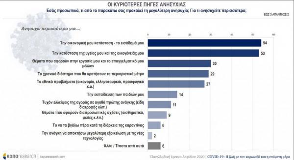 Κύριες πηγές ανησυχίας αποτελούν η οικονομική κατάσταση του νοικοκυριού και η κατάσταση της οικογενειακής υγείας με ποσοστά 54% και 53% αντίστοιχα, λογική εξέλιξη καθώς στους τομείς αυτούς εντοπίζονται και οι μεγαλύτερες συνέπειες της πανδημίας. Άλλες πηγές ανησυχίας αποτελούν τα θέματα της εργασίας και του επαγγελματικού μέλλοντος (30%), η χρονική διάρκεια των περιοριστικών μέτρων (29%) και τα μεγάλα εθνικά προβλήματα (27%) όπως η οικονομία, τα ελληνοτουρκικά και το προσφυγικό.