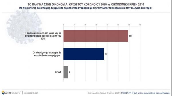 Με νωπές τις μνήμες της κρίσης χρέους, σχεδόν 6 στους 10 συμφωνούν με την άποψη ότι η οικονομική κρίση στη χώρα μας θα είναι τόσο βαθιά όσο και η κρίση του 2010 και στην πλειοψηφία τους φοβούνται ότι η κρίση που θα ακολουθήσει θα είναι πιο βαθιά και πιο σκληρή από τη γενικότερη αίσθηση (52% για την παγκόσμια οικονομία και 59% για την ελληνική οικονομία), αλλά και συγκριτικά με την υπόλοιπη Ευρώπη, η κρίση της χώρας μας θα είναι πιο βαθιά σύμφωνα με το 65%.