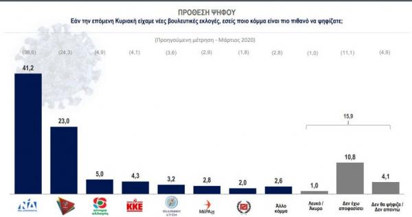 Η αποτελεσματική διαχείριση της υγειονομικής κρίσης χαρίζει σημαντικό κεφάλαιο για τη διαχείριση της δύσκολης οικονομικής περιόδου που ακολουθεί. Ο πρωθυπουργός χαίρει της θετικής γνώμης του 60% της ελληνικής κοινωνίας, ενώ η Νέα Δημοκρατία αυξάνει τα ποσοστά της εκλογικής της επιρροής, καταγράφοντας σημαντική διαφορά, άνω των 18 μονάδων, από τον ΣΥΡΙΖΑ στην πρόθεση ψήφου και καθαρή υπεροχή στην παράσταση νίκης.