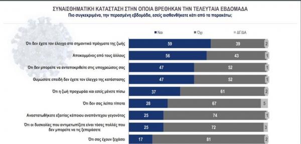 Πιο συγκεκριμένα, 6 στους 10 πολίτες αναφέρουν απώλεια ελέγχου στα σημαντικά πράγματα της ζωής ή/και αποκομμένοι από τους άλλους, 5 στους 10 αισθάνονται ότι αδυνατούν να ανταποκριθούν στις υποχρεώσεις τους και θυμώνουν επειδή νιώθουν ότι δεν έχουν τον έλεγχο της κατάστασης. Τέλος, ένα σημαντικό 37% δηλώνει ότι αισθάνεται πως η ζωή προχωράει και εκείνο μένει πίσω. Όπως προαναφέρθηκε, οι καταγραφές αυτές εμφανίζονται πιο έντονα στα νεότερα κοινά και τα χαμηλά εισοδήματα.