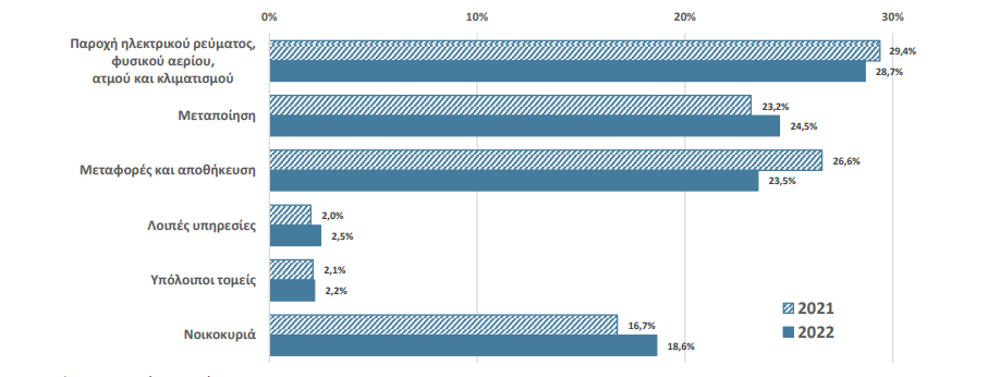 - O τομέας της «Παροχής ηλεκτρικής ενέργειας, φυσικού αερίου, ατμού και κλιματισμού» είχε τη σημαντικότερη συμμετοχή στις εκπομπές CO2 με ποσοστό 28,7% επί του συνόλου των εκπομπών CO2 για το έτος 2022 και με 29,4% για το 2021.