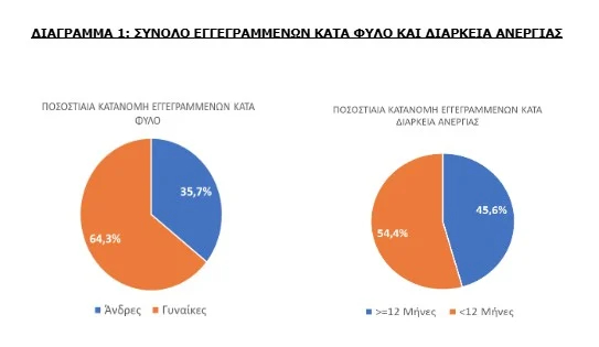 Το σύνολο των εγγεγραμμένων στο μητρώο της ΔΥΠΑ για τον μήνα Δεκέμβριο 2025, ανήλθε σε 915.889 άτομα. Από αυτά 417.534 (ποσοστό 45,6%) άτομα είναι εγγεγραμμένα στο μητρώο της ΔΥΠΑ για χρονικό διάστημα ίσο ή και περισσότερο των 12 μηνών και 498.355 (ποσοστό 54,4%) είναι εγγεγραμμένα στο μητρώο της ΔΥΠΑ για χρονικό διάστημα μικρότερο των 12 μηνών.