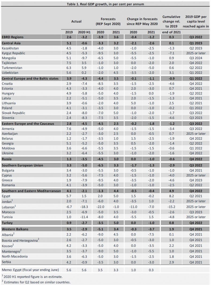 Το lockdown που επιβλήθηκε τον Μάρτιο επηρέασε σοβαρά την κατανάλωση και τη συνολική οικονομική δραστηριότητα. Τα αποτελέσματα ήταν περισσότερο ορατά το δεύτερο τρίμηνο του 2020 όταν το ΑΕΠ συρρικνώθηκε κατά 15,2 τοις εκατό από έτος σε έτος, μία από τις μεγαλύτερες πτώσεις στις περιοχές που επενδύει η EBRD.