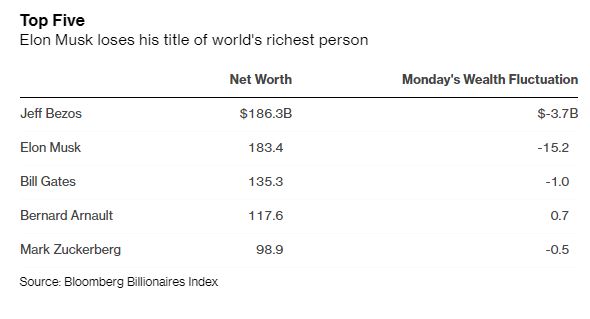 Ο Μασκ πλέον πέφτει στη δεύτερη θέση στη λίστα Bloomberg Billionaires Index των 500 πιο πλούσιων ανθρώπων στον κόσμο, με περιουσία 183,4 δισ. δολαρίων, από 210 δισ. που είχε τον Ιανουάριο. Ο ιδρυτής της Amazon.com Τζεφ Μπέζος επανέρχεται στην πρώτη θέση, ακόμη και αν η περιουσία του υποχώρησε κατά 3,7 δισ. δολάρια, φτάνοντας στα $186,3 δισ. τη Δευτέρα. Στην τρίτη θέση ο Μπιλ Γκέιτς.