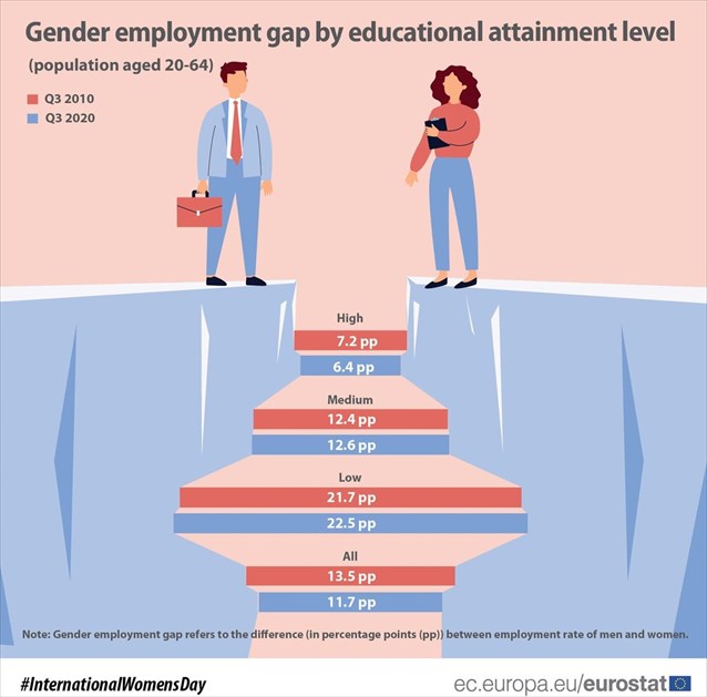 Να σημειωθεί ότι κατά την τελευταία δεκαετία, το χάσμα στην απασχόληση μεταξύ των δύο φύλων μειώθηκε από 13,5 μονάδες το τρίτο τρίμηνο του 2010 σε 11,7 μονάδες το τρίτο τρίμηνο του 2020. Ομοίως, το χάσμα στην απασχόληση μεταξύ ανδρών και γυναικών με υψηλό επίπεδο εκπαίδευσης μειώθηκε από 7,2 μονάδες το τρίτο τρίμηνο του 2010 σε 6,4 μονάδες το τρίτο τρίμηνο του 2020.