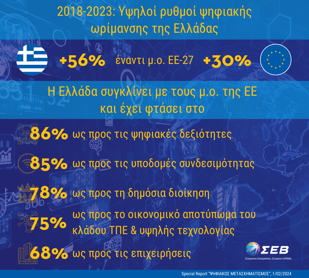 Στην εκδήλωση, βάσει των ευρημάτων του Δείκτη Ψηφιακής Ωριμότητας του ΣΕΒ, αναδείχθηκαν τα βήματα προόδου της Ελλάδας, στην πορεία της προς την επίτευξη των στόχων της Ψηφιακής Δεκαετίας, και υπογραμμίστηκαν τα πεδία στα οποία υπάρχουν σημαντικά περιθώρια βελτίωσης. Ειδικότερα, όπως τονίστηκε, αξιολογώντας την ψηφιακή πορεία της Ελλάδας μεταξύ 2018-2023, τα επίπεδα ψηφιακής ωριμότητας της χώρας βελτιώθηκαν κατά 56%, σχεδόν με διπλάσιο ρυθμό από τον ευρωπαϊκό μ.ο. 30%. Η βελτίωση αυτή ήταν η υψηλότερη στην ΕΕ, όμως συναρτάται με το χαμηλό επίπεδο ψηφιακής ωριμότητας που καταγραφόταν πριν από μια πενταετία. Παρά τη βελτίωση, υπάρχει ακόμα απόσταση μέχρι τη σύγκλιση με τον μ.ο. της ΕΕ27 στις υποδομές συνδεσιμότητας (85% μ.ο. ΕΕ), τις ψηφιακές δεξιότητες (86% μ.ο. ΕΕ), τις επιχειρήσεις (68% μ.ο. ΕΕ), τη δημόσια διοίκηση (78% μ.ο. ΕΕ), αλλά και το οικονομικό αποτύπωμα του κλάδου ΤΠΕ (Τεχνολογιών Πληροφορικής & Επικοινωνιών) & υψηλής τεχνολογίας (75% μ.ο. ΕΕ).