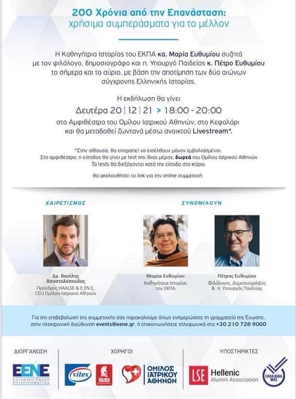 Η εκδήλωση «200 Χρόνια από την Επανάσταση: χρήσιµα συµπεράσµατα για το µέλλον» θα γίνει στις 20/12/2021, 18:00 – 20:00 στο Αμφιθέατρο του Ομίλου Ιατρικού Αθηνών, στο Κεφαλάρι και θα μεταδοθεί ζωντανά μέσω ανοικτού Livestream*.