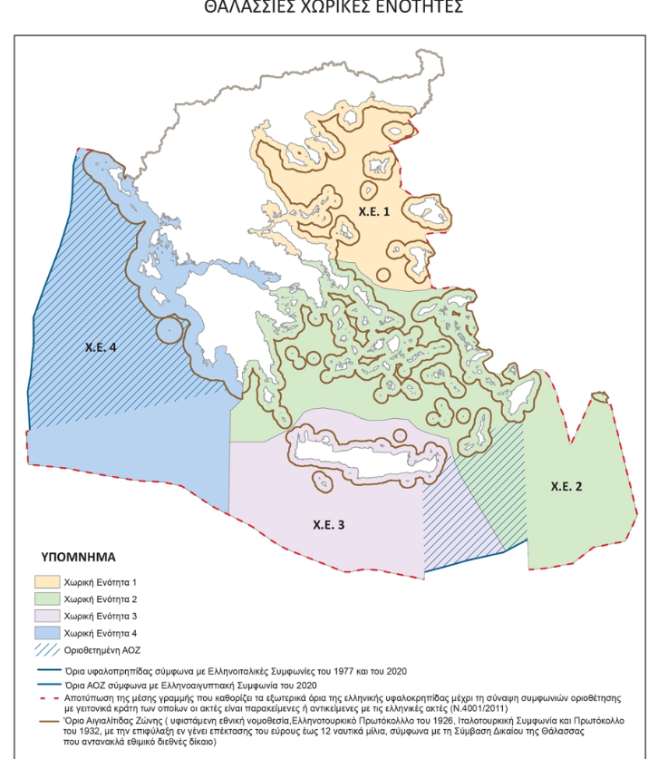 Οι θαλάσσιες περιοχές που αποτυπώνονται στον χάρτη, συμπεριλαμβάνουν τις ελληνοϊταλικές συμφωνίες οριοθέτησης ΑΟΖ του 1977 και του 2020 και την ελληνοαιγυπτιακή συμφωνία του 2020, ενώ συμπίπτουν με τα όρια που απορρέουν από τον νόμο 4001/2011.