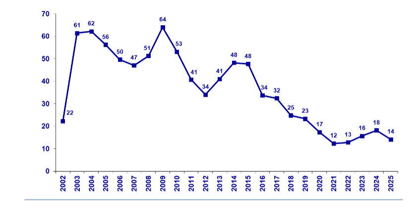 Περίπου 444.000 πλαστά τραπεζογραμμάτια ευρώ αποσύρθηκαν από την κυκλοφορία το 2025, δηλ. υπήρξε μείωση κατά 20% σε σύγκριση με το προηγούμενο έτος. Η πιθανότητα να λάβετε πλαστό τραπεζογραμμάτιο είναι μικρή, καθώς ο αριθμός των πλαστών τραπεζογραμματίων είναι πολύ χαμηλός σε σχέση με τα γνήσια τραπεζογραμμάτια ευρώ σε κυκλοφορία. Το 2025 εντοπίστηκαν 14 πλαστά ανά εκατομμύριο γνήσιων τραπεζογραμματίων σε κυκλοφορία. Πρόκειται για ένα από τα χαμηλότερα επίπεδα από την εισαγωγή του ευρώ και μετά.