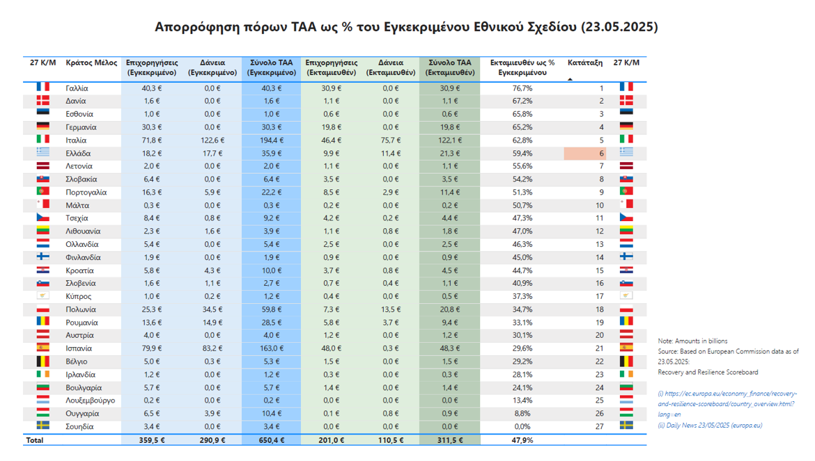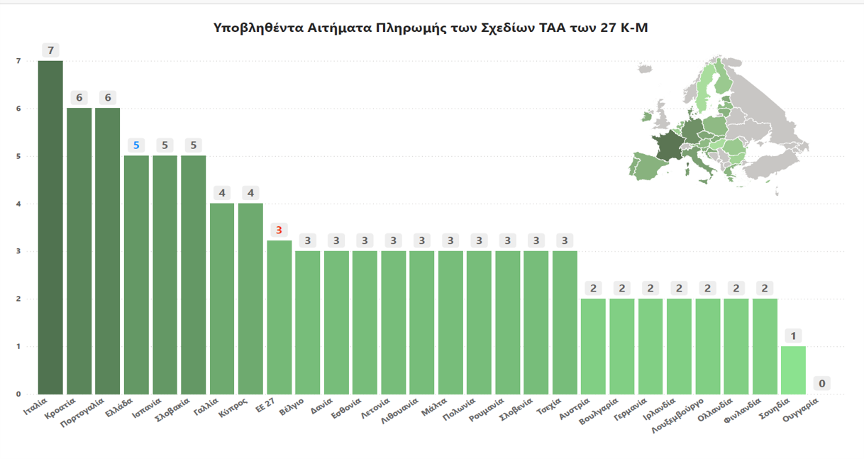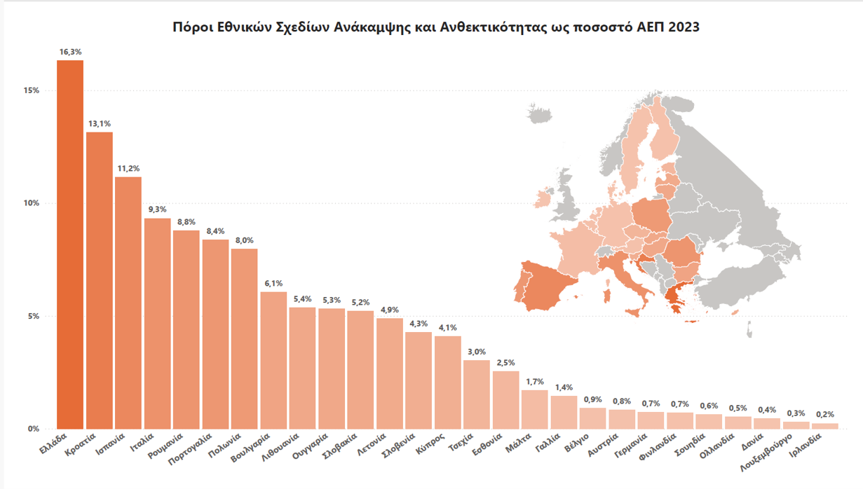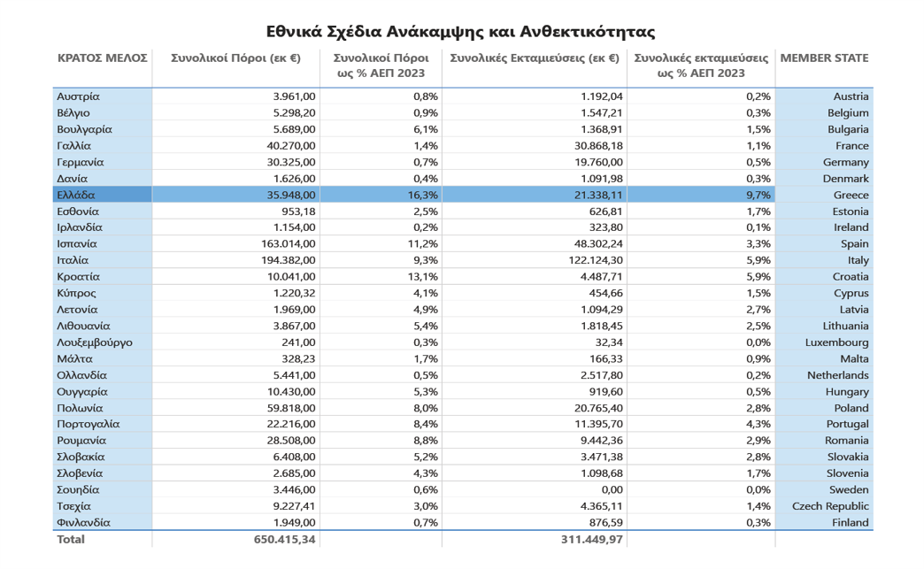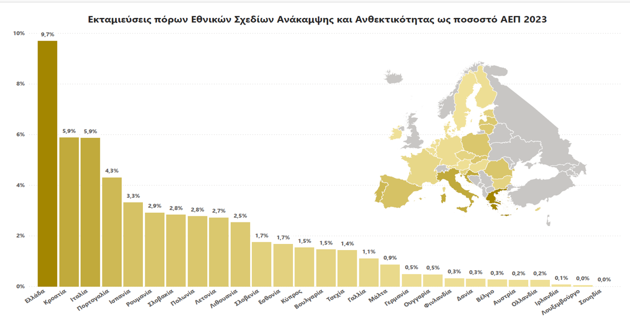 Είναι πρώτη μεταξύ των 27 κρατών-μελών ως προς τους πόρους που έχει εκταμιεύσει ως ποσοστό του ΑΕΠ 2023 (21,3 δισ. ευρώ – 9,7% του ΑΕΠ 2023)