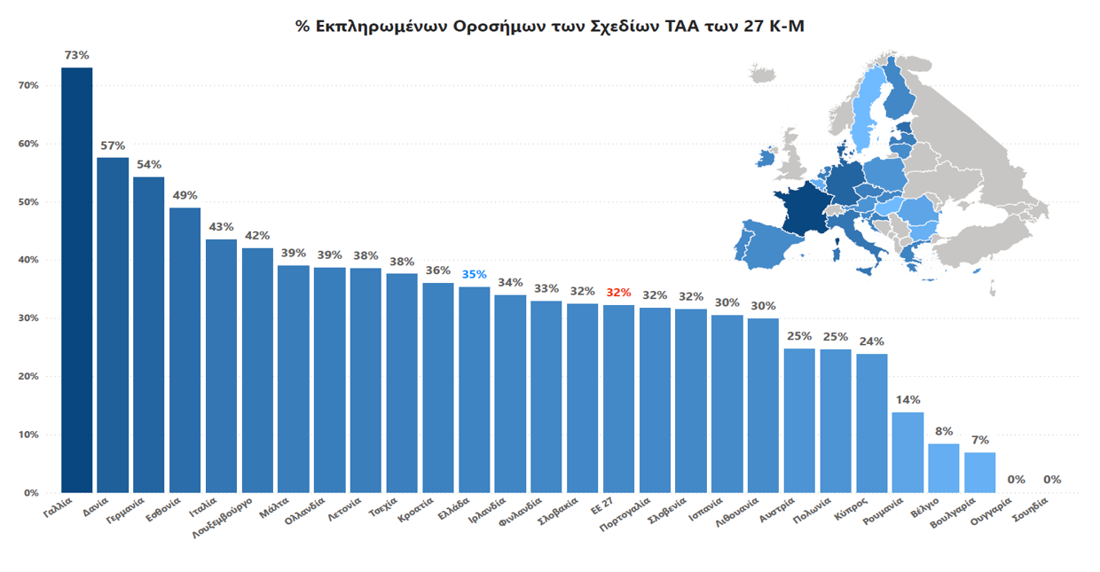 Με 139 εκπληρωμένα ορόσημα, έχει ποσοστό επίτευξης 35%, άνω του ευρωπαϊκού μέσου όρου του που είναι 32%