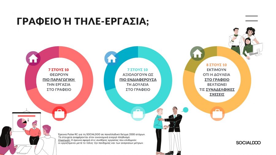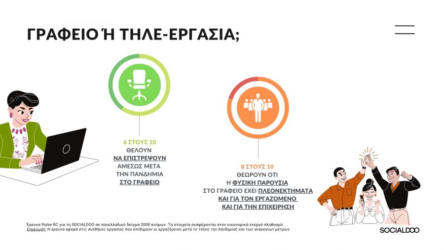 Στρατιές εργαζομένων μετέφεραν το γραφείο τους στο σπίτι, στερήθηκαν τη φυσική επαφή με τους συναδέλφους και ένιωσαν ότι τα όρια μεταξύ προσωπικής και επαγγελματικής ζωής έγιναν δυσδιάκριτα. Βέβαια, η τηλεργασία μας γλίτωσε από χρονοβόρα, ήσσονος σημασίας, meetings και ραντεβού, αλλά και από την κίνηση στους δρόμους. Ωστόσο, παρά την ευελιξία κινήσεων που αποκτήσαμε, η ανάγκη για επιστροφή στο γραφείο ολοένα μεγαλώνει. Το επιβεβαιώνει άλλωστε και η έρευνα δημοσκοπήσεων της PULSE, η οποία έγινε με πρωτοβουλία της εταιρείας στρατηγικής επικοινωνίας SOCIALDOO και εστιάζει στο εργασιακό τοπίο μετά τη λήξη της πανδημίας, καταδεικνύοντας πως οι Έλληνες νοσταλγούν το γραφείο.