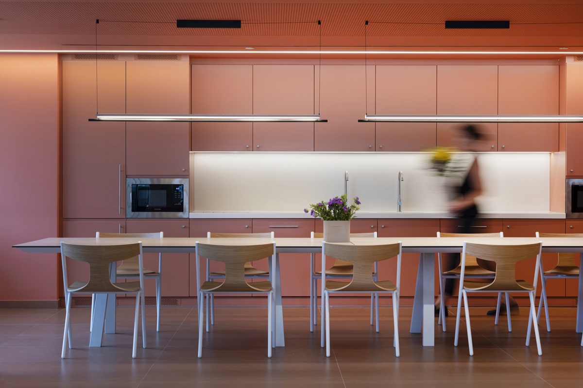 Στο ανατολικό άκρο του κεντρικού άξονα βρίσκονται οι χώροι εκτόνωσης – μεγάλες χρωματιστές κερκίδες που ευνοούν την πιο casual συνεργασία, η μεγάλη κοινόχρηστη τραπεζαρία σε μονοχρωματική τονικότητα και μία κατάφυτη, προσβάσιμη βεράντα.