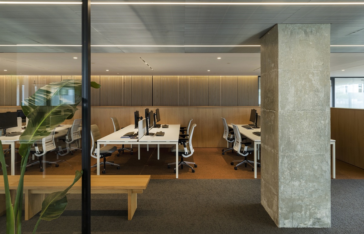 Τα χρώματα των γραφείων είναι ζεστά για να αποδίδουν μια αίσθηση οικειότητας και χρησιμοποιούνται σε αντίθεση με πιο βιομηχανικά στοιχεία, όπως η ψευδοροφή από γραμμικά προφίλ αλουμινίου και τα ανεπίχριστα υποστυλώματα από σκυρόδεμα στον διάδρομο.