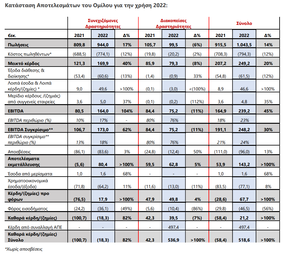 Τα κέρδη προ φόρων του 2022 ανήλθαν στα 68 εκατ. ευρώ, έναντι ζημιών 29 εκατ. ευρώ στη χρήση 2021. Τα συνολικά έσοδα ξεπέρασαν το 1 δισ. ευρώ, στα 1,044 δισ. ευρώ, αυξημένα κατά 14% σε ετήσια βάση.