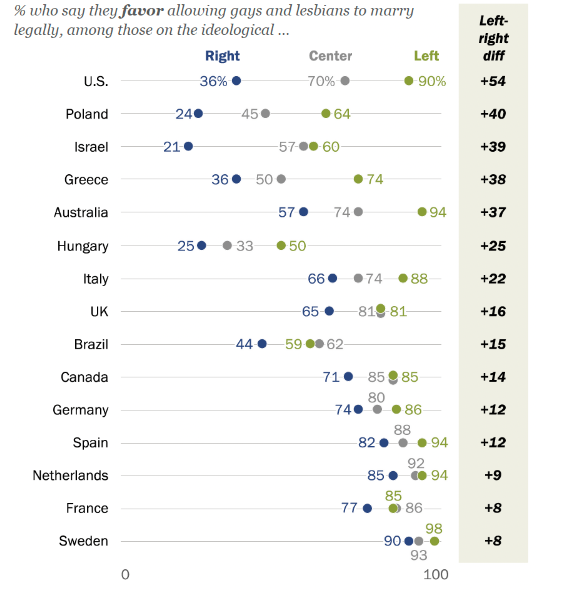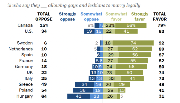 Αντίθετα, το 92% των Σουηδών δηλώνει υπέρ του γάμου των ομόφυλων ζευγαριών. Ακολουθούν Ολλανδία, Ισπανία, Γαλλία, Γερμανία, Ηνωμένο Βασίλειο, και Ιταλία.