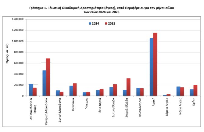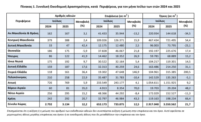Οι εκδοθείσες άδειες Ιδιωτικής Οικοδομικής Δραστηριότητας, στο σύνολο της χώρας, κατά τον μήνα Ιούλιο 2025 ανήλθαν σε 3.118 οικοδομικές άδειες, που αντιστοιχούν σε 724.248 m2 επιφάνειας και 3.501.263 m3 όγκου, παρουσιάζοντας αύξηση κατά 13% στον αριθμό των οικοδομικών αδειών, αύξηση κατά 12,5% στην επιφάνεια και αύξηση κατά 21,6% στον όγκο, σε σχέση με τον αντίστοιχο μήνα του 2024.
