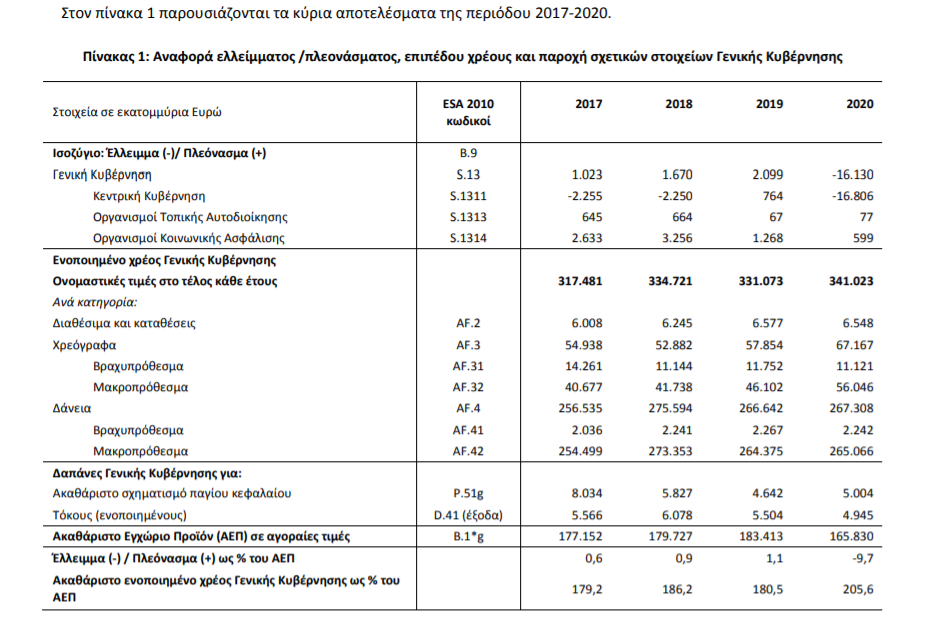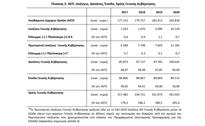 Το έλλειμμα της Γενικής Κυβέρνησης για το έτος 2020, σύμφωνα με το ESA 2010, εκτιμάται στα -16,1 δισ. ευρώ (- 9,7% επί του Ακαθάριστου Εγχώριου Προϊόντος), ενώ το ακαθάριστο ενοποιημένο χρέος της Γενικής Κυβέρνησης σε ονομαστικές τιμές στο τέλος του 2020 εκτιμάται στα 341δισ. ευρώ (205,6% επί του Ακαθάριστου Εγχώριου Προϊόντος).
