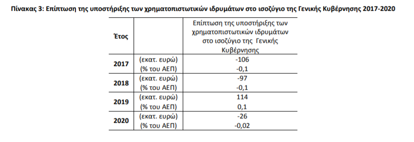 Για το έτος 2019 η υποστήριξη των χρηματοπιστωτικών ιδρυμάτων είχε θετική επίπτωση στο ισοζύγιο Γενικής Κυβέρνησης. Αυτό οφείλεται στο ότι οι δεδουλευμένες αμοιβές που προκύπτουν από τις εγγυήσεις του διατραπεζικού δανεισμού και του συστήματος ομολογιακών δανείων, καθώς και τα έσοδα από τις προνομιούχες μετοχές των τραπεζών, ήταν υψηλότερα από τις δεδουλευμένες δαπάνες. Αντιθέτως, στα έτη 2017, 2018 και 2020 η δαπάνη της υποστήριξης ήταν μεγαλύτερη από τα σχετικά έσοδα.
