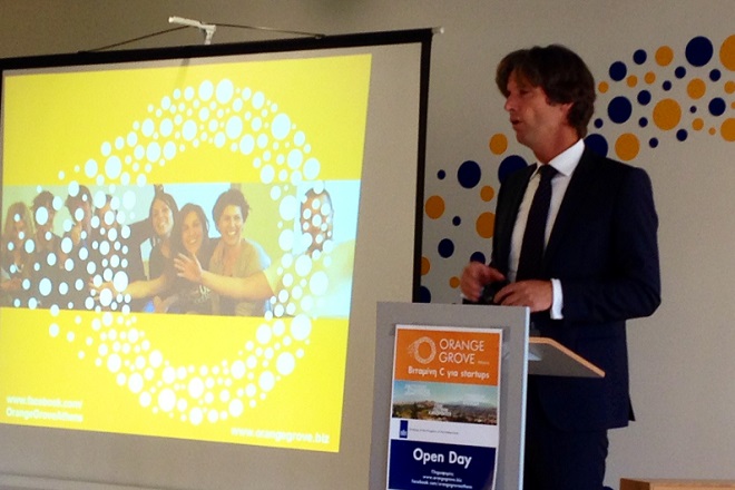 Πίσω από αυτό το ιδιαίτερο εγχείρημα βρίσκεται ο Ολλανδός πρέσβης, κ. Γιαν Φέρστεϊχ, ο οποίος πραγματοποίησε σήμερα στην έδρα του «Orange Grove» έναν μικρό απολογισμό των όσων έχει ήδη καταφέρει ο ολλανδικός «πορτοκαλεώνας» στον πρώτο χρόνο της ζωής του. Συνολικά 47 νεοφυείς επιχειρήσεις, αποτελούμενες από περίπου 90 νέους επιχειρηματίες -Έλληνες και Ολλανδούς- συμμετείχαν στο πρόγραμμα, το οποίο τους προσέφερε επαφές, πιθανούς επενδυτές, τεχνογνωσία, και νέες γνώσεις και ικανότητες, με την υποστήριξη ολλανδικών και ελληνικών εταιρειών, πανεπιστημίων και φορέων.