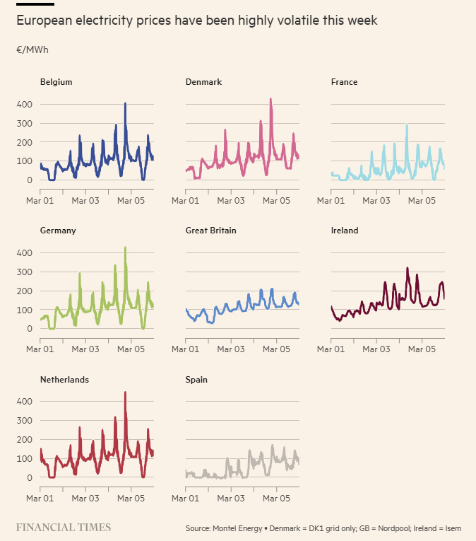 Σύμφωνα με δημοσίευμα των Financial Times, τα στοιχεία της Montel Analytics δείχνουν ότι σε αγορές όπως η Ολλανδία, η Δανία, το Βέλγιο και η Γερμανία οι χονδρικές τιμές μεταβάλλονται κατά εκατοντάδες ευρώ ανά MWh μέσα σε ένα απόγευμα.