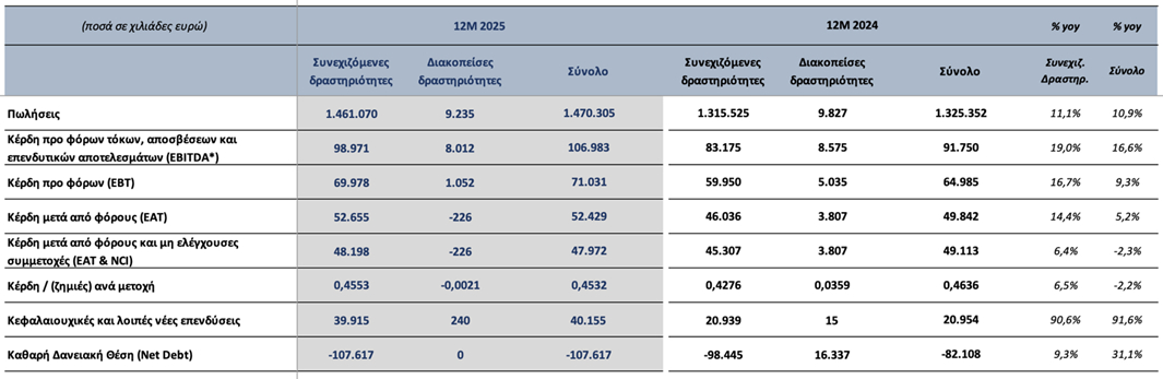 Σε σύγκριση με το 2024, οι πωλήσεις σημείωσαν αύξηση 10,9%, η λειτουργική κερδοφορία (EBITDA) 16,6%, τα κέρδη προ φόρων (ΕΒΤ) 9,3%, τα καθαρά κέρδη μετά από φόρους (ΕAΤ) 5,2%.