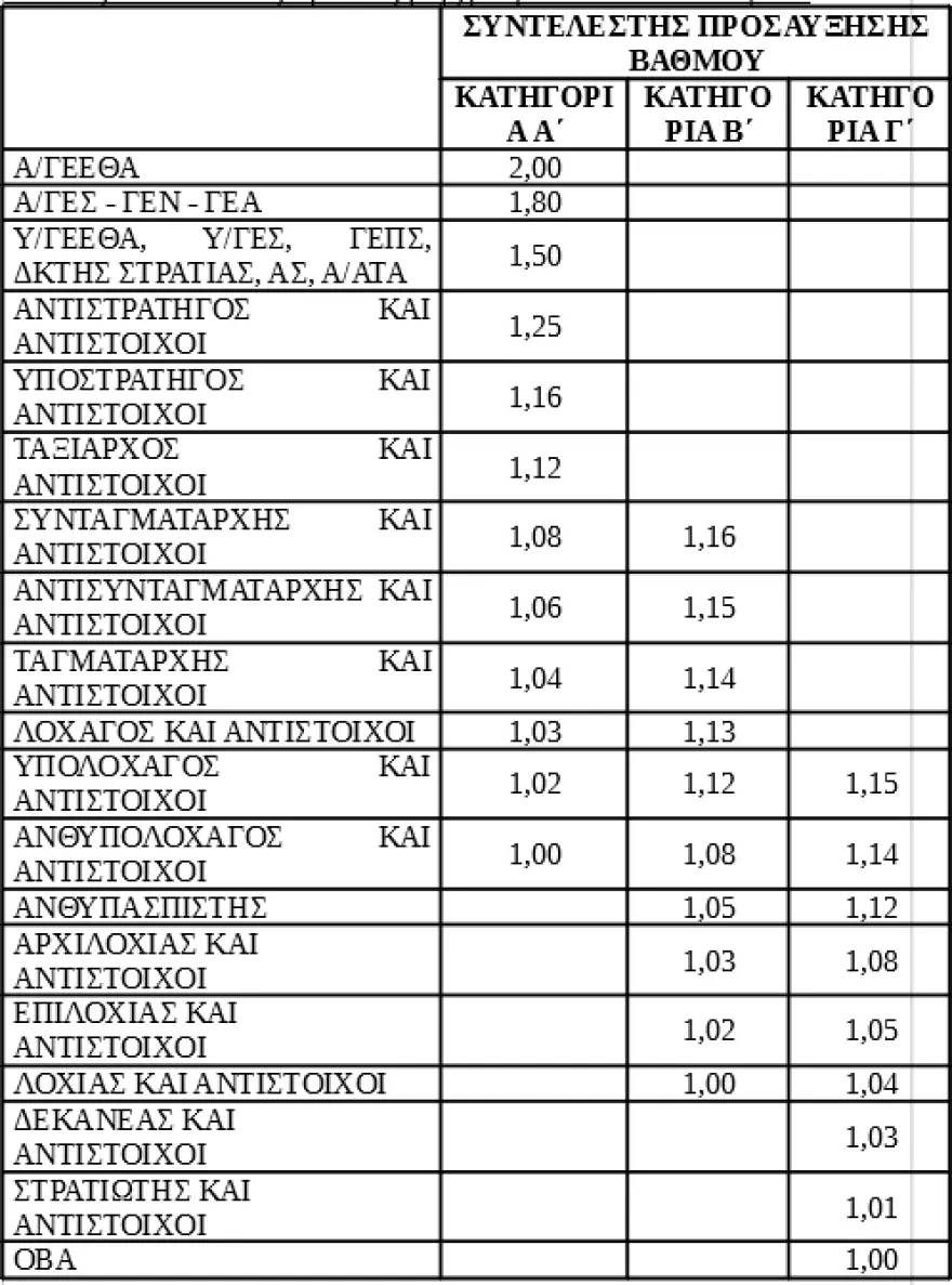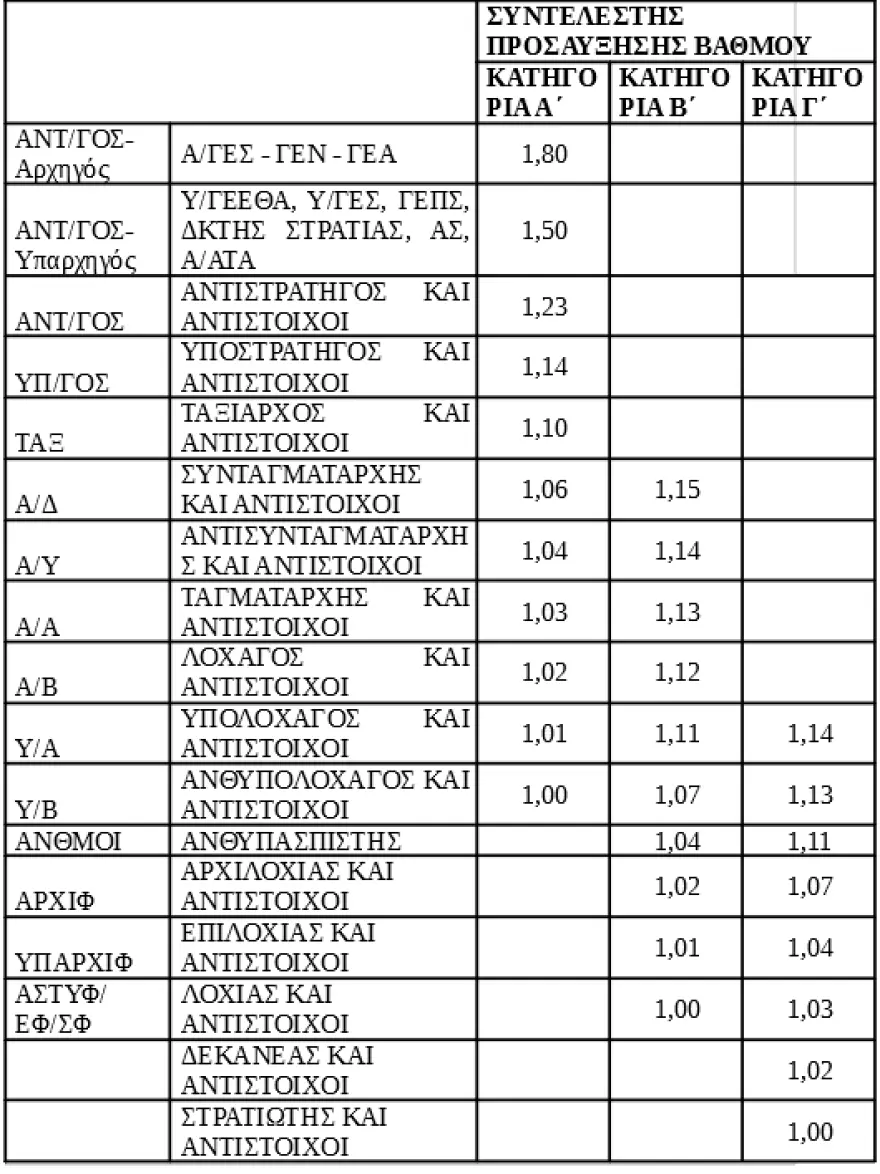 Πίνακας: Συντελεστές Προσαύξησης βαθμού Ενόπλων Δυνάμεων