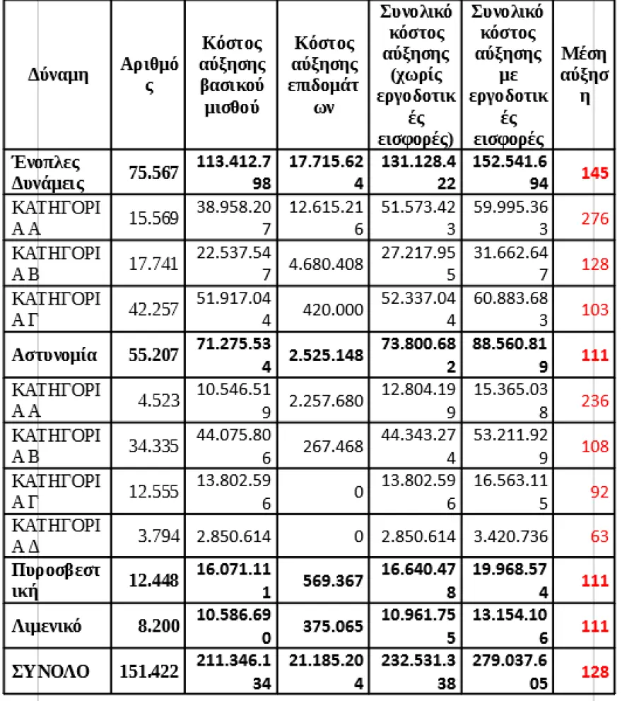 Πίνακας: Κόστος αυξήσεων στο μισθολόγιο των Ενόπλων Δυνάμεων και των Σωμάτων Ασφαλείας