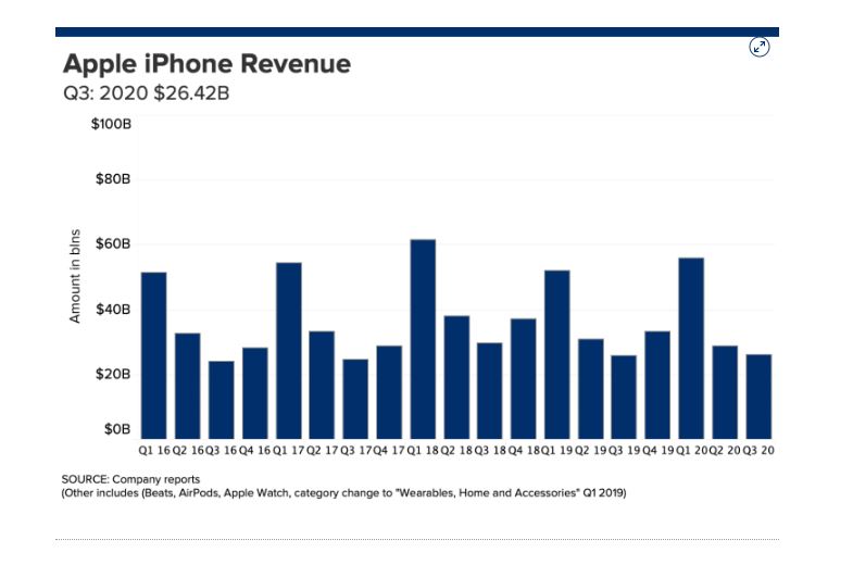 Με το 60% των πωλήσεών της, να προέρχεται από τις διεθνείς αγορές, η Apple με έδρα την κομητεία του Κουπερτίνο στην Καλιφόρνια, είχε έσοδα 26,42 δισεκατομμυρίων δολαρίων από τις πωλήσεις iPhone, ξεπερνώντας κατά 4 δισεκατομμύρια δολάρια τις προβλέψεις των αναλυτών, που ανέμεναν πωλήσεις 22,37 δισεκατομμυρίων δολαρίων, σύμφωνα με τα στοιχεία αγοράς (Refinitiv).